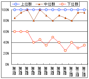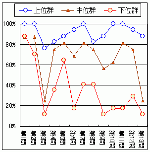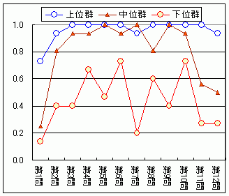 表2は各問題の得点と残りの問題の合計得点との相関(I-R相関),グラフ4は回答者全体をその合計得点によって上位群,中位群,下位群(各3分の1)に分けたときの群別・問題別正答率のグラフである.