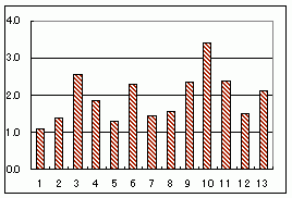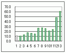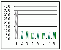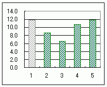 グラフ2は横軸が問題番号,縦軸は直前の操作以降その問題の採点までの経過時間(秒)を表わす.ただし,第1問は解説を読む時間を含む.