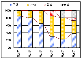 左のグラフ1は問題ごとの正答,誤答,無答の割合(正誤は最初の採点)で,黄色で示したものは初め誤答で再試行の結果正答に変った割合を表わす.この頁については無答答案が多いので「正答率」という用語の通常の使用法に従って解答者に対する割合もその下に示す.