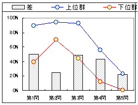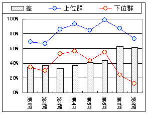 グラフ5は合計得点によって回答者全体を上位群と下位群(各50%)に分けたときの問題別正答率である.これによれば,第7問,第8問が得点差が出やすい問題であることが分かる.
