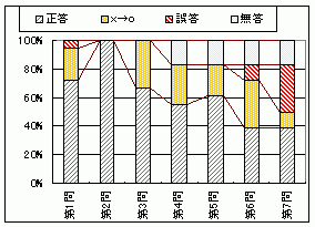 左のグラフ1は問題ごとの正答,誤答,無答の割合(正誤は最初の採点)で,黄色で示したものは初め誤答で再試行の結果正答に変った割合を表わす.その下のグラフは「正答率」の通常の定義に従って,無答者を除く解答者に対する割合で示したもの.