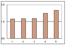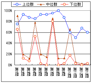 グラフ6は回答者全体をその合計得点によって上位群,中位群,下位群の3群に等分したときの群別・問題別正答率である.これによれば,第1問において中位群が上位群と接している他は,UL指数(上位群の正答率-下位群の正答率)も高く,どの問題も識別力が高い.