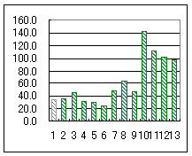 グラフ2は横軸が問題番号,縦軸は直前の操作以降その問題の採点までの経過時間(秒)を表わす.ただし,第1問は初めからの時間.