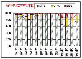 左のグラフ1は問題ごとの正答,誤答,無答の割合(正誤は最初の採点)で,黄色で示したものは初め誤答で再試行の結果正答に変った割合を表わす.この頁については無答答案が多いので,正答率の通常の定義に従って無答を除いた解答者に対する割合をその下に示す.
