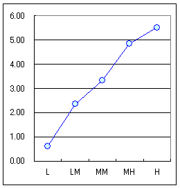 グラフ5は回答者全体をその合計得点によって高(H)〜低(L)の5群に等分したときの群別正答率である.これによれば,合計得点はどの群に対しても識別力が高いことが分かる.