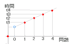 | ■3 最初の問題に着手するまでの時間 ■2で述べたように,各頁には操作ボタン以外の特別なものはなく,一覧形式で提示している教材では,読者の視線がどの文章を見ているのかは直接には分からない.このため,ある解説が分かりやすいかどうか,その解説はその場所に必要かどうかなどを読者の行動から判断するために,「解説が読まれた時間」「操作方法が納得できるまでにかかった時間」=「最初の問題に着手するまでの時間」が手掛かりとなる. 右図において赤丸で示した点が時間を測定できる箇所とする. 中学数学の用語で言えば,右の直線の傾きが「1題当たりの所要時間」になる.この場合において,初めの解説が読まれた時間は右図○の時間を推定すれば求まる.(切片を求める) 切片を推定するために,第1問完了時間から「1題当たり所要時間」(平均値)を引く方法が考えられるが,右図2のように実際に使う問題配列では,番号が進むほど難しくなるのが普通で,その場合第1問完了時間から1題当たり「平均」所要時間を引くと負の値となり,うまく求まらない.(朱色で示したもの) そこで,1題当たり所要時間の平均値を使うのをやめ,単純に第2問完了時間との差を引いて右図○の時間を求めることにした.(2次,3次,・・曲線による近似でもよい.) このようにして,第1問と第2問が問題形式,問題文の長さ,難易度などでほぼ同質のものであれば,後者の方法により,そうでないときは前者の方法によることとした. 各頁において「3題以上解答すれば送信可能」としたのは,一方においては空データの繰り返し送信を防ぐためでもあるが,他方においては第1問〜第3問の解答時間が凸凹になっていないかどうかを確かめるためでもある. |