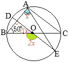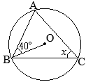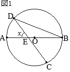 •BCが直径だから∠BAC=90° •さらに,DE∥ACだから ∠BDE=90° •△OBDは直角三角形だから ∠DOB=40° •円周角∠BAE=xに対応する中心角は,∠BOE=2xだから 2x+40°=180° x=70°…(答)