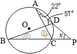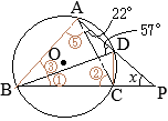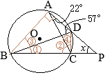 •同一の弧\(\stackrel{\huge\frown}{\mathrm{DC}}\)の円周角,∠DACと@は等しい@=22° •△BPDで∠Dの外角=@+x 57°=22°+x x=35°…(答) (考え方2) ♪♫→多面的に別解を考える:思考力がUP←♬♠