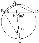 【問題9】図で,A, B, C, Dは円周上の点で,線分ACは∠BADの二等分線である。また,Eは線分ACとBDとの交点である。 ∠DEC=86°, ∠BCE=21°のとき∠ABEの大きさは何度か,求めなさい。 (2025年度 愛知県公立高校入試問題)