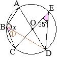 •CEは直径だから∠ABCでAが分かる→x=A+90° ∠CBE=90° •OE=OD=(半径)だから @=35° •@の∠ADEとAの∠WBEとは,同一の弧\(\stackrel{\huge\frown}{\mathrm{AE}}\)の円周角だから,等しい A=35° •∠x=90°+35°=125°…(答) |