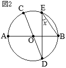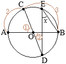 【問題5】次のの中の「あ」「い」に当てはまる数字をそれぞれ答えよ。 右の図2で,点Oは線分ABを直径とする円の中心であり,3点C, D, Eは円Oの周上にある点である。 5点A, B, C, D, Eは右の図2のように,A, D, B, E, Cの順に並んでおり,互いに一致しない。 点Bと点E,点Cと点D,点Dと点Eをそれぞれ結ぶ。 線分CDが円Oの直径,\(\displaystyle \stackrel{\huge\frown}{\mathrm{AC}}=\frac{2}{5}\stackrel{\huge\frown}{\mathrm{AB}}\)のとき,xで示した∠BEDの大きさは あい 度である。 (2024年度 東京都公立高校入試問題)