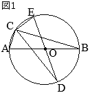 【問題12】次のの中の「い」「う」に当てはまる数字をそれぞれ答えよ。 右の図1で点Oは線分ABを直径とする円の中心であり,2点C, Dは円Oの周上にある点である。 4点A, B, C, D は図1のようにA, B, C, D の順に並んでおり,互いに一致しない。 点Bと点D,点Cと点Dをそれぞれ結ぶ。 線分ABと線分CDとの交点をEとする。 点Aを含まない \(\stackrel{\huge\frown}{\mathrm{BC}}\) について, \(\stackrel{\huge\frown}{\mathrm{BC}}=2\stackrel{\huge\frown}{\mathrm{AD}}\),∠BDC=34°のとき,xで示した∠AEDの大きさは,いう度である。 (2022年度 東京都公立高校入試問題)
