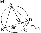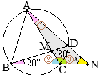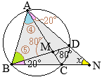 •同一の弧\(\displaystyle \stackrel{\huge\frown}{\mathrm{CD}}\)の円周角は等しいから(△ACNなど) @が分かる Aが分かる\(\Big\}\)→Bが分かる→xが分かる @=20° •△BCMにおいて,∠Mの外角は,他の2つの内角の和に等しいから 80°=20°+A A=60° •B=180°−60°=120° •△ACNの内角の和は180°だから ∠x+120°+20°=180° ∠x=40°…(答) (別解1) ♪♫→多面的に別解を考える:思考力がUP←♬♠