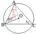 •Oが円の中心だから,OA=OB(=半径)@=40° •△OABの内角の和は180°だから @+A+40°=180° A=100° •弧 \(\stackrel{\huge\frown}{\mathrm{AB}}\)の中心角がAだから,円周角∠xは,その半分 ∠x=50°…(答) |
