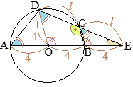 ⇒ DC=CE=l, AO=OB=BE=4 (cm)とおくと 相似図形 △CBE(∽△DOE)∽△ADE から,相似比の等式 CE:BE=AE:DEが使える ![]() @ ABCDは円に内接する四角形だから ∠ECB=∠DAB…(1) △CDEと△ADEについて • ∠Eは共通 • (1)により∠ECB=∠DAB 2つの三角形で,2組の角がそれぞれ等しいから △CBE∽△ADE…(2) \({\rm CE:BE=AE:DE}\) そこで,DC=CE=l(cm)とおくと \(l:4=12:2l\) \( 2l^2=48\) \( l^2=24\) \( l=\sqrt{24}=2\sqrt{6}\hspace{5px}(cm)\) (2)により,相似図形の面積比は,相似比の2乗(比)だから \({\rm \triangle CBE:\triangle ADE}=(2\sqrt{6})^2:12^2\) \(=24:144=1:6\) △CBE:⏢ABCD=1:(6−1)=1:5 △CBEの面積は,⏢ABCDの面積の\(\displaystyle\frac{1}{5}\)倍…(答) A △DOE∽△ADEだから \({\rm DO:OE=AD:DE}\) \( 4:8={\rm AD}:4\sqrt{6}\) \( 8{\rm AD}=16\sqrt{6}\) \( {\rm AD}=2\sqrt{6}\hspace{5px}(cm)\)…(答) (別解) △OADはOA=ODの二等辺三角形だから ∠OAD=∠ODA これにより,DOは∠ADEの二等分線になるから AD:DE=AO:OE \( {\rm AD}:4\sqrt{6}=4:8\) \( 8{\rm AD}=16\sqrt{6}\) \( {\rm AD}=2\sqrt{6}\hspace{5px}(cm)\)…(答) |
