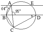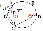 •AE∥BDにより,平行線の錯角は等しいから∠FAG=∠DGA 64°+@=95° @=31° •同一の弧\(\stackrel{\huge\frown}{\mathrm{BC}}\)に対する円周角は等しいから A=@=31°…(答) |