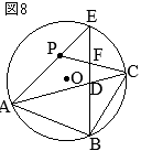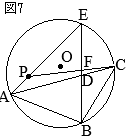 •AB=ADだから△ABDの両底角は等しい@=A •AとBは対頂角 A=B •CとDは弧 \(\stackrel{\huge\frown}{\mathrm{EC}}\)の円周角 C=D…(#1) •△OCFにおいて,∠Fの外角は,他の2つの内角の和に等しいから B+F=E •仮定によりE=@+Cだから B+F=@+C F=C…(#2) (#1)(#2)より,D=F △PACの両底角が等しいから,PA=PC…(証明終) (2)