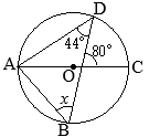 •△ABEにおいて,「∠Eの外角は,他の2つの内角の和に等しい」から,A+44°=80°A=36° •△ADCは,∠D=90°の直角三角形だから,A+B=90° B=54° •Bとxは同一の弧\(\stackrel{\huge\frown}{\mathrm{AD}}\)の円周角だから等しい x=54°…(答)