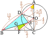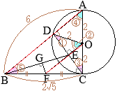A△CAD∽△BACだから BA:AC=CA:AD \(6:4=4:{\rm AD}\) \(\displaystyle{\rm AD}=\frac{16}{6}=\frac{8}{3}\) したがって \(\displaystyle{\rm BD}=6-\frac{8}{3}=\frac{10}{3}\) ![]() *こんな話を生徒に教えても委員会! ※この問題に手を付けると,時間内に解けないかもしれん! 捨てる問題を見分ける判断力も必要 \(\displaystyle{\rm BE^2}=(\frac{10}{3})^2+(\frac{2}{3}\sqrt{5})^2=\frac{120}{9}\) \(\displaystyle{\rm BE}=\frac{2\sqrt{30}}{3}\) DB∥EF (AB∥OF)だから \({\rm DB:EF=AC:OC}=2:1\) \({\rm EF}=\frac{5}{3}\) DB∥EFにより,錯角は等しいから,△EDB∽△FGE BE:ED=EF:FG \(\displaystyle \frac{2\sqrt{30}}{3}:\frac{2}{3}\sqrt{5}=\frac{5}{3}:{\rm FG}\) \(\displaystyle {\rm FG}=\frac{10\sqrt{5}}{9}\times\frac{3}{2\sqrt{30}}=\frac{5\sqrt{6}}{18}\hspace{2px}(cm)\)…(答) |
