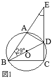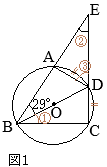 【問題4】右の図1で,2点A, Cは線分BDを直径とする円Oの周上の点である。また,\(\stackrel{\huge\frown}{\mathrm{AD}}=\stackrel{\huge\frown}{\mathrm{CD}}\)である。線分BAを点Aの方向に延長した直線と,線分CDを点Dの方向に延長した直線の交点をEとする。 ∠ABD=29°のとき,∠AEDの大きさとして正しいものを,次のア〜オの中から1つ選んで,その記号を書きなさい。 ア 16° イ 29° ウ 32° エ 42° オ 58° (2025年度 茨木県公立高校入試問題)
