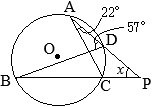 【問題10】右の図のように,円Oの周上に4点A, B, C, Dをとり,直線ADと直線BCとの交点をPとします。∠CAD=22°, ∠ADB=57°のとき,∠APBの大きさxを求めなさい。 (2025年度 埼玉県公立高校入試問題)