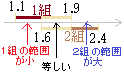普通の中学生の立場で考えた場合,階級内で極端な偏りがあっても,1組は最大では7.5〜9.4→範囲は1.9,最小では7.9〜9.0→範囲は1.1