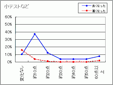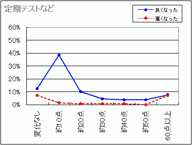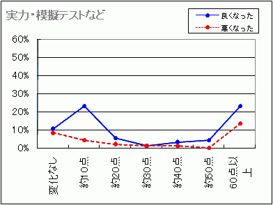 ==> 全体の傾向として、10点〜20点よくなる人が多く,実力試験では60点以上よくなる場合もあるようです。(実力テストで60点よくなるとは,20点→80点など.こんなに多い?)