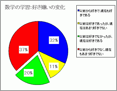 ※ このホームページを用いた数学学習の効果に関するアンケートの結果は、次の通りでした。(2006.3.12〜2008.09.26現在/回答数331件中のパーセント) (数学の学習の好き嫌いは回答数360件中のパーセント)