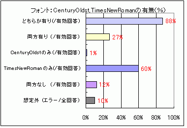 2007.12.15〜2008.09.15までの回答408件(有効回答366件)の集計結果は次の通りでした.(なお,想定外とは読者か作者のどちらかが考え違いしているものを指し,実際にはあり得ない組合せです.)![]() (私見) おそらく,Word,一太郎というワープロソフトの導入率が各々「Times new Roman」「 CenturyOldst」の割合に対応しているのではないか.---ただし,若年層を分母とする統計で |