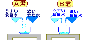 | A君とB君はそれぞれうすい食塩水と濃い食塩水の2種類を持っていて,各自の食塩水を混ぜる.