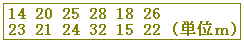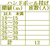 | 下の資料は,ある中学校の男子生徒12人のハンドボール投げの記録です。この資料から右の度数分布表を完成させなさい。