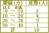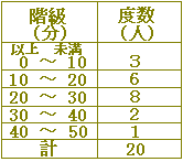 | 右の表は,ある学級の生徒10人を選んで,通学にかかる時間を調べて,度数分布表にまとめたものである。この表から,これら生徒10人の通学にかかる時間の平均値を求めると,何分になるか。 | ![]() |