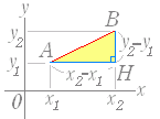 (解説)2点間の距離の公式は,三平方の定理を使って示すことができる. 右図において直角三角形 AHB の横の長さは AH=x2 - x1,縦の長さは BH=y2 - y1 だから,斜辺の長さ AB は,三平方の定理から で,2点 A(x1 , y1 ) , B(x2 , y2 ) 間の距離が求められる. ※ この公式は B の x 座標や y 座標が A の x 座標や y 座標よりも小さいときも成り立つ.(2乗するので,どちらの場合も正になる.) ※ AB が縦に並んでいるとき( x1=x2 ) のとき)や,AB が横に並んでいるとき( y1=y2 ) のとき)は直角三角形にならないが,AB は各々縦または横の長さとなって,この公式の結果は正しい. 要するに,この公式は常に成り立つ. |