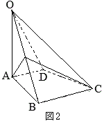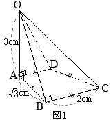 問2右図において,\({\rm AB^2+BC^2=AC^2}\)となるから ア ∠ABC=90°である。⇒ 〇 イ 線分ACは,3点A, B, Cを通る円の直径である。⇒ 〇 ウ 四角形ABCDは台形である。⇒ × エ 点Dは,3点A, B, Cを通る円の円周上にある。⇒ 〇 以上から,正しくないものはウ 底面ABCDの面積は \(\displaystyle \frac{2\times\sqrt{3}}{2}\times 2=2\sqrt{3} \) 四角すいOABCDの体積は \(\displaystyle \frac{2\sqrt{3}\times 3}{3}=2\sqrt{3}\hspace{5px}(cm^3) \)