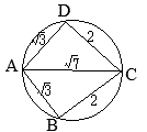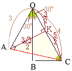 (別解)AからOCに降ろした垂線の足をKとおくと,右図において△ACKは∠Kが90°の直角三角形になるから \(\displaystyle {\rm AC^2}=(\frac{3\sqrt{3}}{2})^2+(\frac{5}{2})^2=\frac{27}{4}+\frac{25}{4}=\frac{52}{4}=13 \) \(\displaystyle {\rm AC}=\sqrt{13} \) |