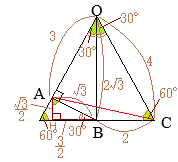 △OABは∠OAB=90°の直角三角形だから,三平方の定理により \(\displaystyle {\rm OB^2}=3^2+(\sqrt{3})^2=12 \) \(\displaystyle {\rm OB}=\sqrt{12}=2\sqrt{3} \)