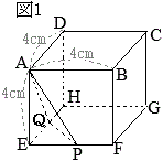 【問題9】図1,図2,図4のように,1辺が4 cmの立方体ABCDEFGHがある。また,辺EF, EHの中点をそれぞれP, Qとする。このとき,次の問いに答えなさい。 問1 図1において,三角 AEPQの体積は何\(cm^3\)か。