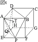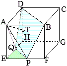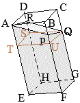 立体ABDEPQは四角錘AQPBDと三角錐AQEPに分けられる。 三角錐AQEPの体積は \(\displaystyle \frac{2\times 2}{2}\times 4\div 3=\frac{8}{3}\) 四角錘AQPBDの体積は \(\displaystyle \frac{56}{3}-\frac{8}{3}=\frac{48}{3}=16\) これを四角錘AQPBDの高さ\({\rm AT}\)を使って表すと \(\displaystyle \frac{18{\rm AT}}{3}=16\) \(\displaystyle {\rm AT}=\frac{48}{18}=\frac{8}{3}\hspace{5px}(cm)\) |