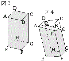 【問題10】図1〜図4のように,AB=AD=\(3\sqrt{2}\hspace{2px}cm\),AE=\(8\hspace{2px}cm\)の正四角柱ABCD-EFGHがある. このとき,次の(1)〜(3)に答えなさい。ただし,円周率は\(\pi\)とする。 (1),(2) 略 (3) 図3のように,正四角柱ABCD-EFGHの容器に水を満たした。次に,図4のように,この容器を傾けると,水がこぼれて,水面が四角形APQRになった。ただし,点P, Q, Rは,それぞれ辺BF, CG, DH上にあり,BP=DRとする. 残っている水の体積が,