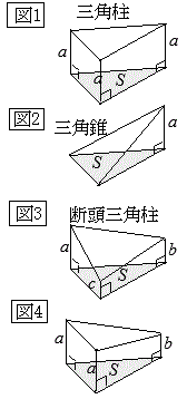 右図1のような底面積が\(S\)で高さが\(h\)の三角柱の体積は\(\displaystyle V=S\times a\)…(1) 右図2のような底面積が\(S\)で高さが\(a\)の三角錘の体積は \(\displaystyle V=S\times \frac{a}{3}\)…(2) 右図3のような底面積が\(S\)で,これに垂直な高さが各々\(a,b,c\)である断頭三角柱の体積は \(\displaystyle V=S\times \frac{a+b+c}{3}\)…(3) 右図4のような底面積が\(S\)で,これに垂直な高さが各々\(a,a,b\)である断頭三角柱の体積は \(\displaystyle V=S\times \frac{a+a+b}{3}\)…(4) フランス革命で断頭台に消えたマリーアントワネットの話は有名・・・植物では,バラや菊の切り花をもらったときに,花の部分を切り取って挿し木にすると,養分を浪費しないので根付きやすい (1) ⇔ \(\displaystyle V=S\times \frac{a+a+a}{3}\) (2) ⇔ \(\displaystyle V=S\times \frac{a+0+0}{3}\) 断頭三角柱の体積の公式が広く一般の場合を表しており,他は幾つかが0であるか等しい特別な場合になっている. 中学校の数学の教科書に(1)(2)は書かれているので,ここではこれらの証明は省略し,(3)の断頭三角柱の体積を証明する.