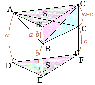 (証明)右図において,a>b>cの場合を例にとって図示しているが,大小関係が他の場合でも,同様に図示すれば証明できる。 三角柱AB'C'-DEFの体積は \(\displaystyle V_1=S\times a \) 三角錐AB'C'-Bの体積は \(\displaystyle V_2=S\times\frac{a-b}{3}\) 三角錐A-BCC'と三角錐A-BC'B'とは,底面をBCC',BC'B'と見ると,高さが頂点Aまでの距離となって共通。BB∥BC'だから,底面BCC'とBC'B'の面積比は\(a-c:a-b\) 三角錐A-BCC'の体積は \(\displaystyle V_3=V_2\times\frac{a-c}{a-b}=S\times\frac{a-c}{3}\) 求める断頭三角柱ABC-DEFの体積は \(\displaystyle V_1-V_2-V_3=S\times a-S\times\frac{a-b}{3}-S\times\frac{a-c}{3}\) \(\displaystyle =S\times\frac{3a-a+b-a+c}{3}=S\times\frac{a+b+c}{3}\) |