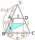 ここでXA=\(\mathscr{l}\)とおくと \(\displaystyle \mathscr{l}:3=(\mathscr{l}+6):7 \) \(\displaystyle 7\mathscr{l}=3\mathscr{l}+18 \) \(\displaystyle 4\mathscr{l}=18 \) \(\displaystyle \mathscr{l}=\frac{18}{4}=\frac{9}{2} \) 次に,△XADと△XIJも相似図形だから \(\displaystyle \frac{9}{2}:3=(\frac{9}{2}+2):{\rm IJ} \) \(\displaystyle \frac{9}{2}{\rm IJ}=3\times\frac{13}{2} \) \(\displaystyle {\rm IJ}=\frac{13}{3} \) 右図において,△ABPは直角三角形だから \(\displaystyle {\rm AP}^2+2^2=6^2 \) \(\displaystyle {\rm AP}^2=36-4=32 \) \(\displaystyle {\rm AP}=\sqrt{32}=4\sqrt{2} \) AP:IR=6:4だから \(\displaystyle 4\sqrt{2}:{\rm IR}=6:4 \) \(\displaystyle {\rm IR}=\frac{16\sqrt{2}}{6}=\frac{8\sqrt{2}}{3} \) 求める三角錐の体積は \(\displaystyle {\rm IR\times IJ\div 2}\times{\rm FB}\div 3=\frac{8\sqrt{2}}{3}\times\frac{13}{3}\times\frac{1}{2}\times 9\times\frac{1}{3} \) \(\displaystyle =\frac{52\sqrt{2}}{3}\hspace{5px}(cm^3) \) |