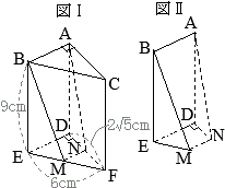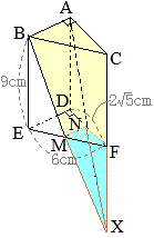 ==図形を延長して,計算しやすい三角錐を作る==BM, CF, ANの延長線が交わる点をXとおく. このとき,X-ABCは三角錐で,X-NMFも三角錐になる. \({\rm EF=6,DF=2\sqrt{5}}\)で△DEFは∠D=90°の直角三角形だから \(\displaystyle {\rm DE^2}=6^2-(2\sqrt{5})^2=16\) \(\displaystyle {\rm DE}=4\) 三角柱ABC-DEFの体積は \(\displaystyle \frac{2\sqrt{5}\times 4}{2}\times 9=36\sqrt{5}\)…(#1) 三角錘X-ABCの体積は \(\displaystyle \frac{2\sqrt{5}\times 4}{2}\times 18\div 3=24\sqrt{5}\)…(#2) 三角錘X-NMFの体積は \(\displaystyle \frac{\sqrt{5}\times 2}{2}\times 9\div 3=3\sqrt{5}\)…(#3) 立体ABC-NMFの体積は,(#2)−(#3)により \(\displaystyle 21\sqrt{5}\)…(#4) 求める立体AB-DEMNの体積は,(#1)−(#4)により \(\displaystyle 15\sqrt{5}\)…(答) (別解)==図形を2つに分けて,計算しやすい形にする==