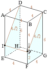 (3) 体積が大きい方の立体は,右図のDIPC-HEFGその表面積は,次の6個の面積の和になる □IEFP=2×4=8 □EFGH=4×4=16 □HGCD=6×4=24 □IPCD=\(4\sqrt{2}\times4=16\sqrt{2}\) ⏢FGCP=⏢EHDI \(\displaystyle =\frac{(2+6)\times 4}{2}=16\) \(\displaystyle S=8+16+24+16\sqrt{2}+16\times 2=80+16\sqrt{2}\)…(答) |