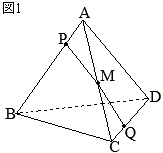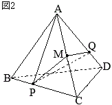 【問題2】右の図1に示した立体 A-BCDは,1辺の長さが6 cmの正四面体である。 辺ACの中点をMとする。 点Pは,頂点Aを出発し,辺AB,辺BCを毎秒1 cmの速さで動き,12秒後に頂点Cに到着する。 点Qは,点Pが頂点Aを出発するのと同時に頂点Cを出発し,辺CD,辺DA上を,点Pと同じ速さで動き,12秒後に頂点Aに到着する。 点Mと点P,点Mと点Qをそれぞれ結ぶ。 次の各問に答えよ。 [問1] 次の の中の「く」「け」に当てはまる数字 をそれぞれ答えよ。 図1において,点Pが辺AB上にあるとき,MP+MQ=l cmとする。