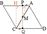 [問1]右の展開図(一部)において,△ABCと△ACDはいずれも正三角形で,∠BAC=∠DCA=60°(錯角が等しい)だからAB∥DC 次に,AP=CQで点Mは点ACの中点だから,PMQは直線になる. このとき,MP+MQが最短になるのは,PQ⊥ABのとき ABの中点をHとすると,上記の場合CH=PQ,\({\rm AH=3,AC=6,CH=3\sqrt{3}}\) したがって \(\displaystyle {\rm AP}=\frac{3}{2}\) 毎秒1cmの速さで動くから,\(\displaystyle \frac{3}{2}\)秒後…(答) 前記のワンポイント・レッスン 図Uにおいて,a=b=c=6, p=4,q=3,r=4の場合を考えると ![]() 難し過ぎ! 泣きですわ! また、正四面体の体積は \(\displaystyle V=\frac{\sqrt{2}}{12}\times 6^3=18\sqrt{2}\) 結局 \(\displaystyle V'=18\sqrt{2}\times\frac{2}{9}=4\sqrt{2}\hspace{5px}(cm^3)\)…(答) |