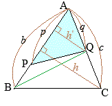 【三角形の面積比】右図において,△APQの面積は \(\displaystyle\triangle APQ=\triangle ABC\times\frac{p}{b}\times\frac{q}{c}\) に等しい (証明) △ABCと△ABQとは,底辺△ABが共通だから,面積の比は,高さ\(h:h_1\)の比に等しい。 ここで,相似図形の性質により,\(h:h_1=c:q\)だから \(\displaystyle\triangle ABQ=\triangle ABC\times\frac{q}{c}\) 次に,△ABQと△APQとは,高さ\(h_1\)が共通で,面積の比は,底辺の長さ\(b:p\)の比に等しい。 \(\displaystyle\triangle APQ=\triangle ABQ\times\frac{p}{b}\) したがって \(\displaystyle\triangle APQ=\triangle ABC\times\frac{q}{c}\times\frac{p}{b}\)…(証明終)∎