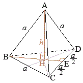 1辺の長さが\(a\) (cm)の正四面体(正三角錐)の高さ\(h\) (cm)は\(\displaystyle h=\frac{\sqrt{6}}{3}a\) (cm) 1辺の長さが\(a\) (cm)の正四面体(正三角錐)の体積\(V\) (cm3)は \(\displaystyle V=\frac{\sqrt{2}}{12}a\) (cm3) (証明) △BCDは正三角形で,CDの中点をEとおくと \(\displaystyle BC=a, CE=\frac{1}{2}a,BE=\frac{\sqrt{3}}{2}a\) Aから底面△BCDに引いた垂線の足をHとくと,Hは△BCDの重心になっているから \(\displaystyle BH=\frac{2}{3}BE=\frac{\sqrt{3}}{3}a\) △ABHは∠H=90°の直角三角形だから,三平方の定理により \(\displaystyle h^2+\Big(\frac{\sqrt{3}}{3}a\Big)^2=a^2\) \(\displaystyle h^2=a^2-\frac{1}{3}a^2=\frac{2}{3}a^2\) \(\displaystyle h=\sqrt{\frac{2}{3}}a=\frac{\sqrt{6}}{3}a\) (cm)…∎ 次に,体積を(底面積)×(高さ)÷3によって求めると \(\displaystyle V=(a\times\frac{\sqrt{3}}{2}a\div 2)\times\frac{\sqrt{6}}{3}a\div 3=\frac{\sqrt{2}}{12}a^3\) (cm3)…∎ |