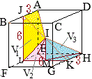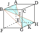 3 線分PQが動いてできる図形は,右図の水色で示した△ABIと△GHIいずれも,底辺の長さはAB(GH)=6,高さはJK=BG=\(6\sqrt{2}\)の半分だから,面積は \(\displaystyle (6\times 3\sqrt{2}\div 2)\times 2=18\sqrt{2}\hspace{5px}(cm^2)\)
