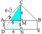 (3) ABの中点をM,DEの中点をNとすると,右図の相似図形から\(\displaystyle {\rm PM:CM=DN:CN} \) \(\displaystyle {\rm PM}:6=6:9 \) \(\displaystyle {\rm PM}=4 \) 次に直角三角形△MFCについて,∠Mが90°だから,三平方の定理により